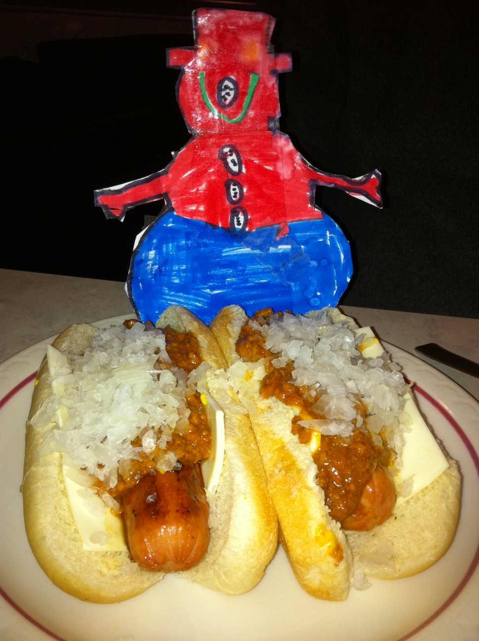 Thanks to our granddaughter, Ryleigh, we had a guest last week whose name was “Flat Frosty” the Snowman. Frosty visited us to see how the weather in PA was different from the weather in VA. He chose a great week to visit and took lots of facts and memories back to Ryleigh’s class! For once, we had less snow than VA, so we were able to take Frosty all over the place!He came to a Chamber of Commerce meeting, visited the Cumberland County Vietnam Vets memorial, and in fact did all the many different activities we squeeze into our time along with running the Carlisle House.Not to be missed was dinner at the Hamilton Restaurant where you have to already KNOW about their famous Hotchee Dogs, because they are not actually anywhere on the menu! Ryleigh’s dad, Sean, has been known to drive up from Virginia to get his Hotchee fix, and we totally understand why!