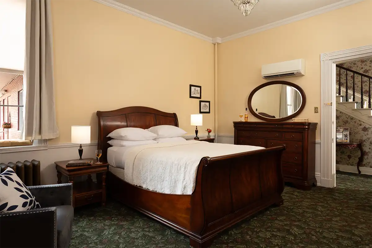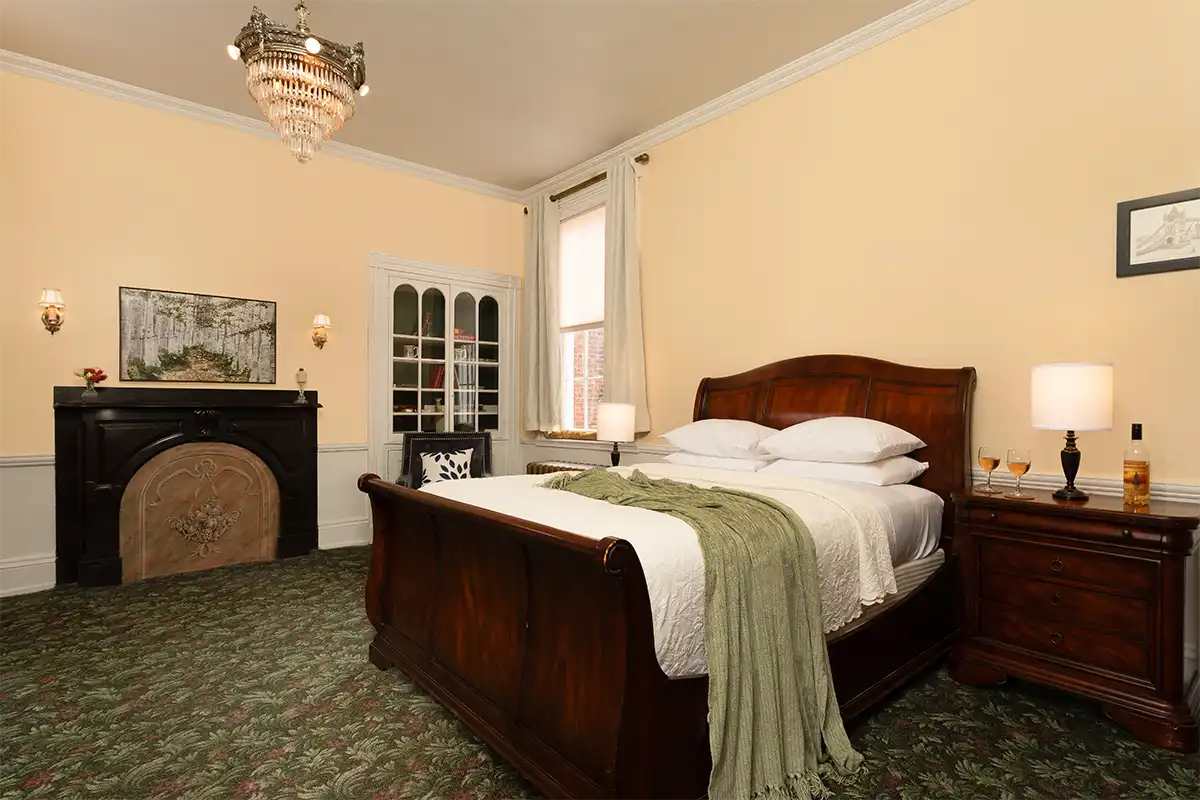 Originally the 1st floor middle parlor, the room features beautiful encased book shelves to either side of the ornamental marbleized slate fireplace and a queen sleigh bed.