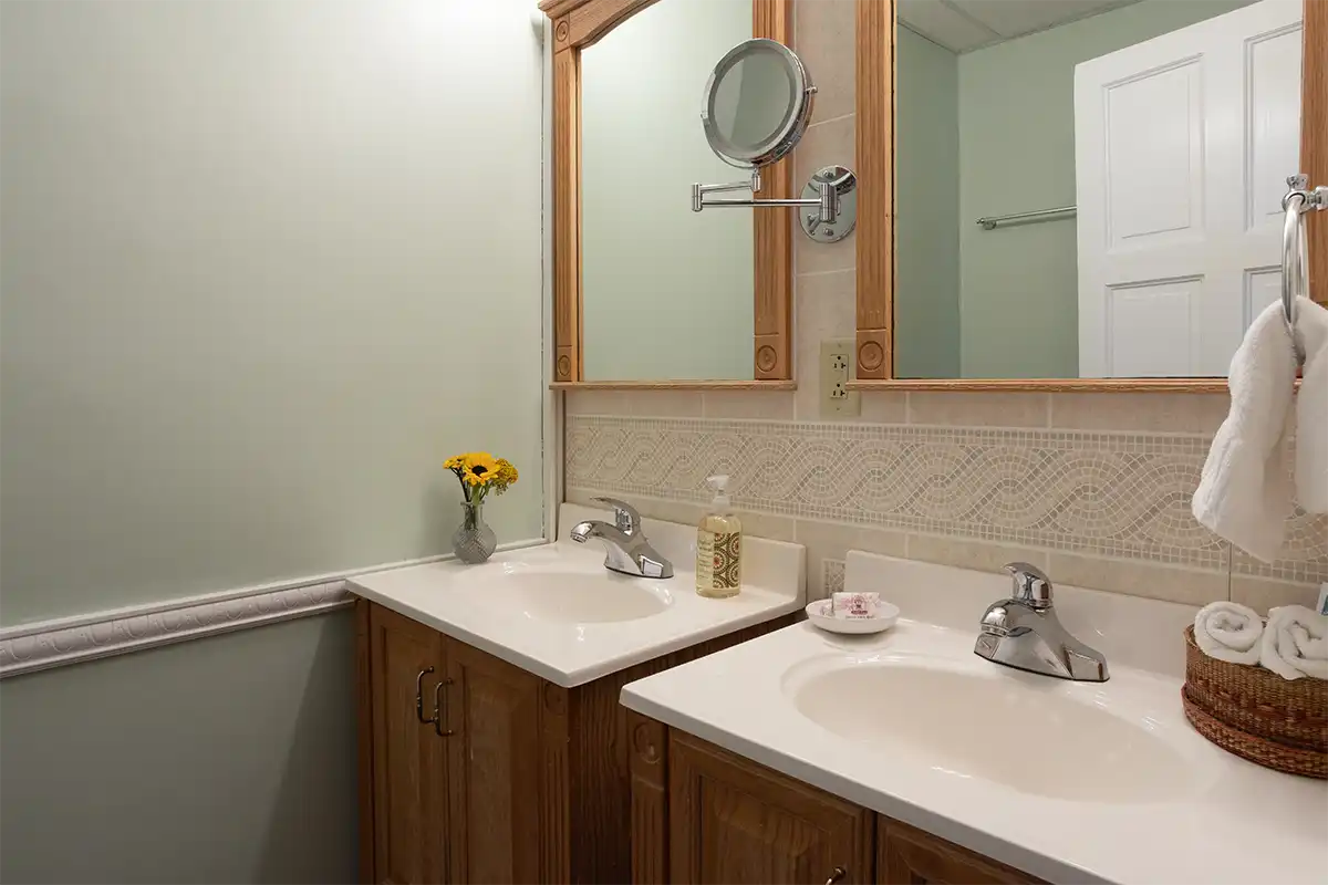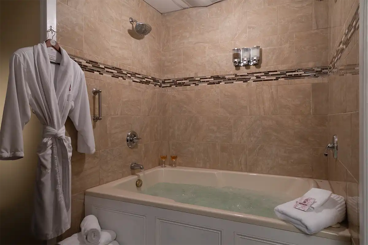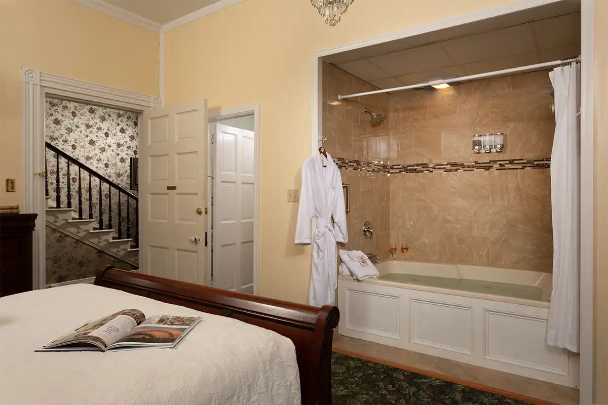 A separate half bath with double vanity is en-suite and an in-room double whirlpool with twin showers can be enjoyed under chandelier light from the 11-foot ceiling.