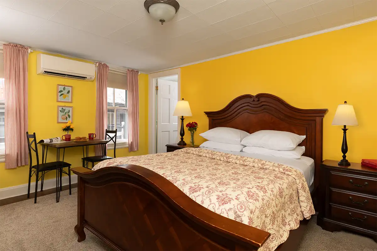 The adjacent cheery yellow bedroom features a fluted iron queen bed with decadent bedding and tan carpet giving a luxurious sunny glow to the room.