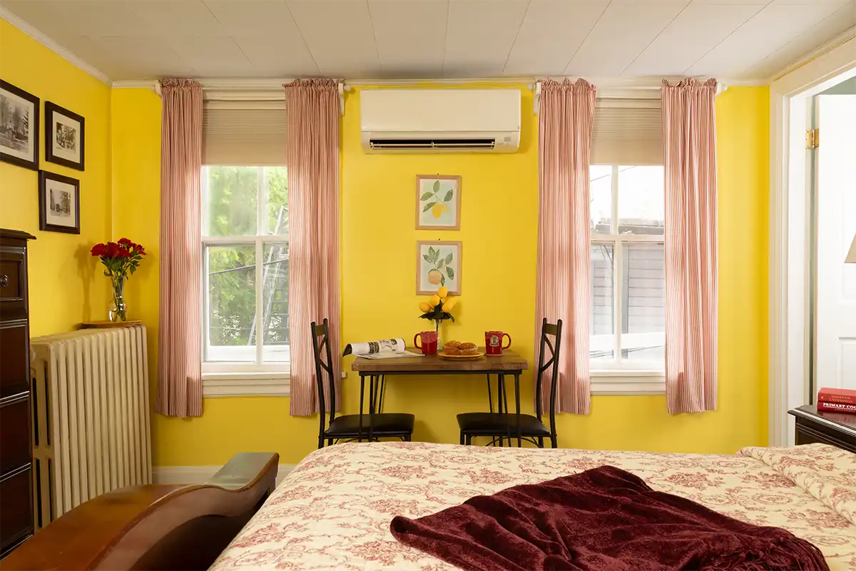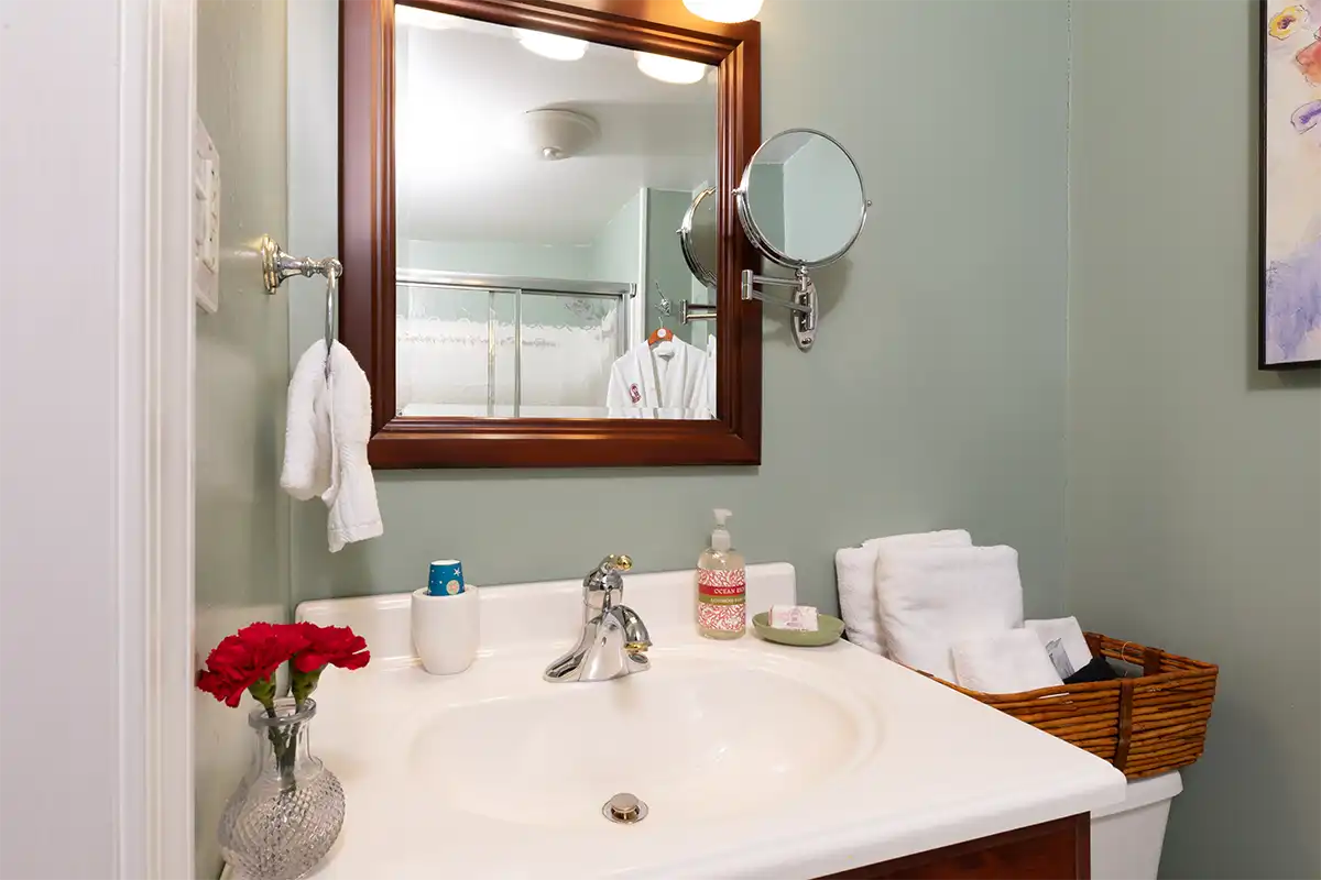 The Hayes Suite, is located on the 2nd floor at the rear. Hayes has two cozy bedrooms with a connecting door, and a private bathroom with large enclosed shower with corner seat, and European-style vanity. Each room has a TV.